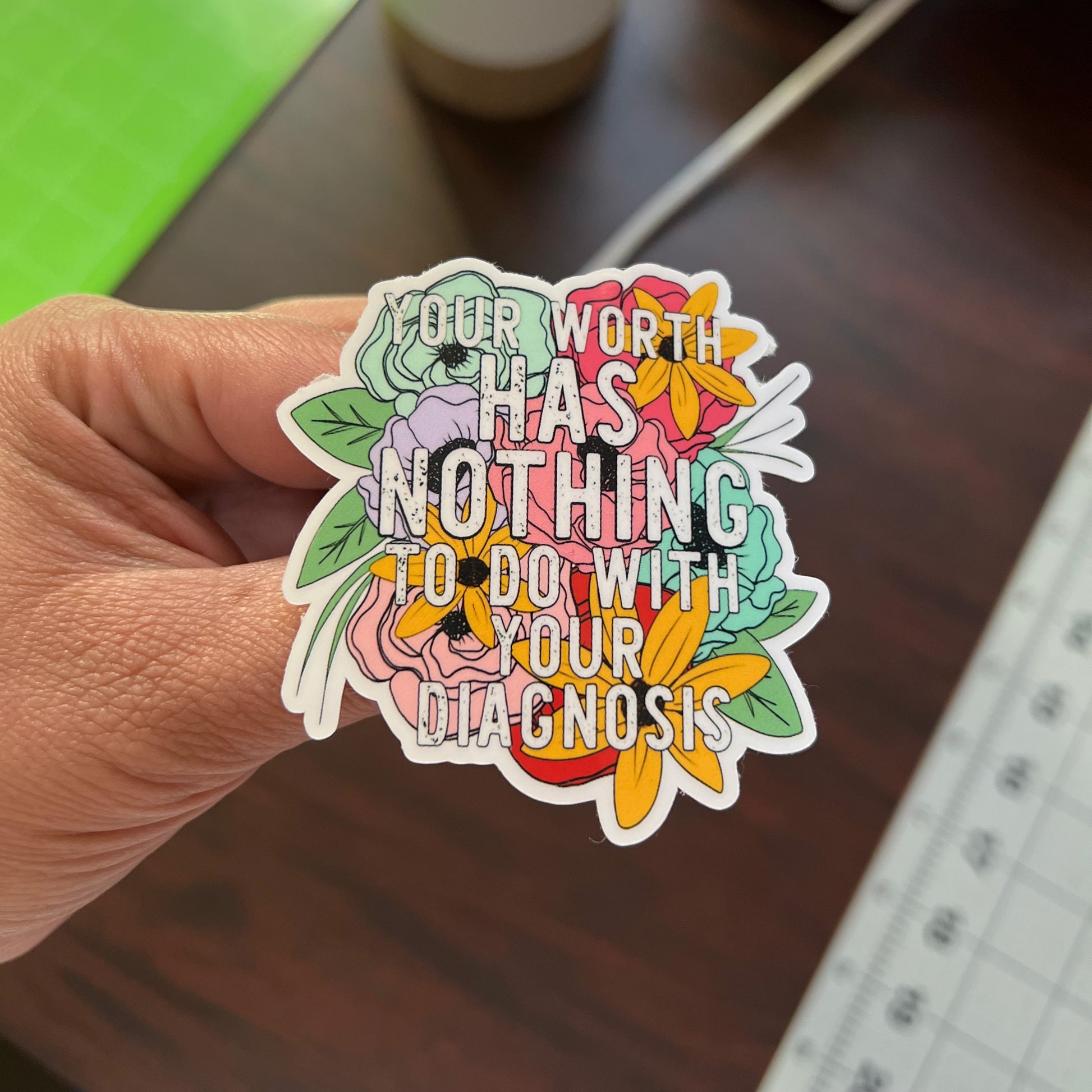 Your Worth Has Nothing To Do With Your Diagnosis sticker. Made of durable vinyl with UV laminate protection.